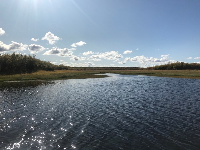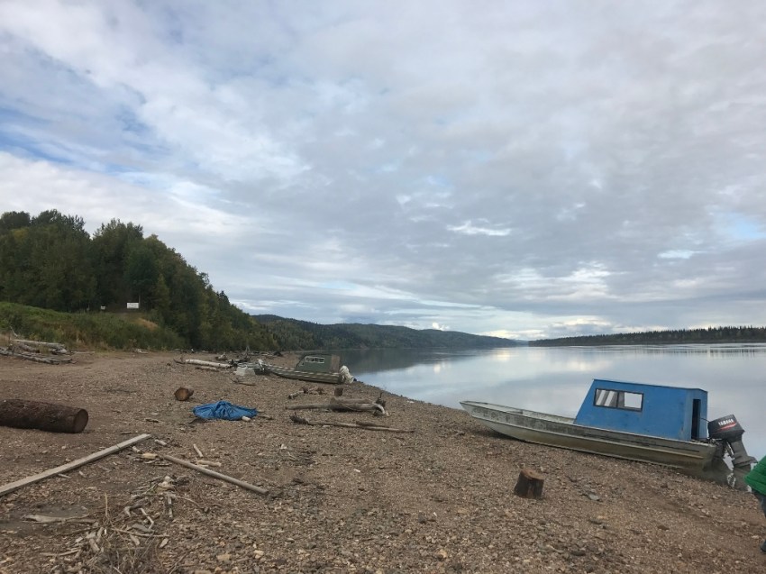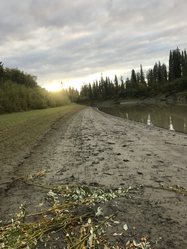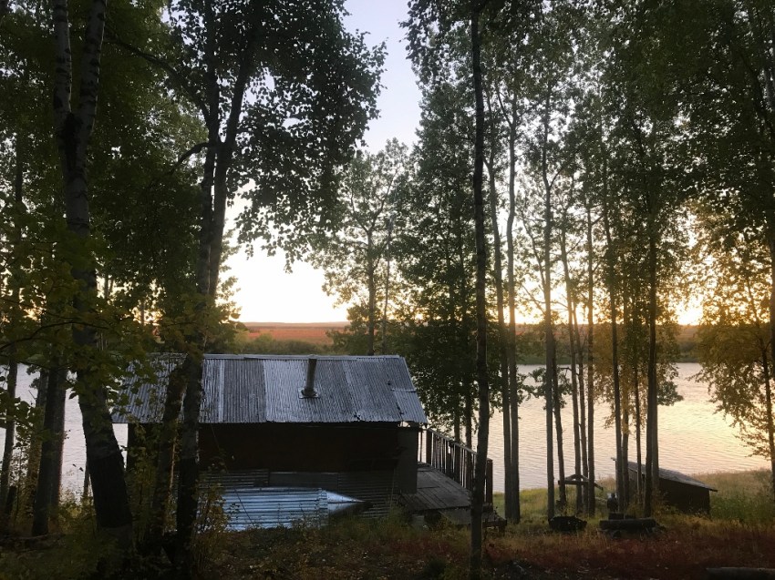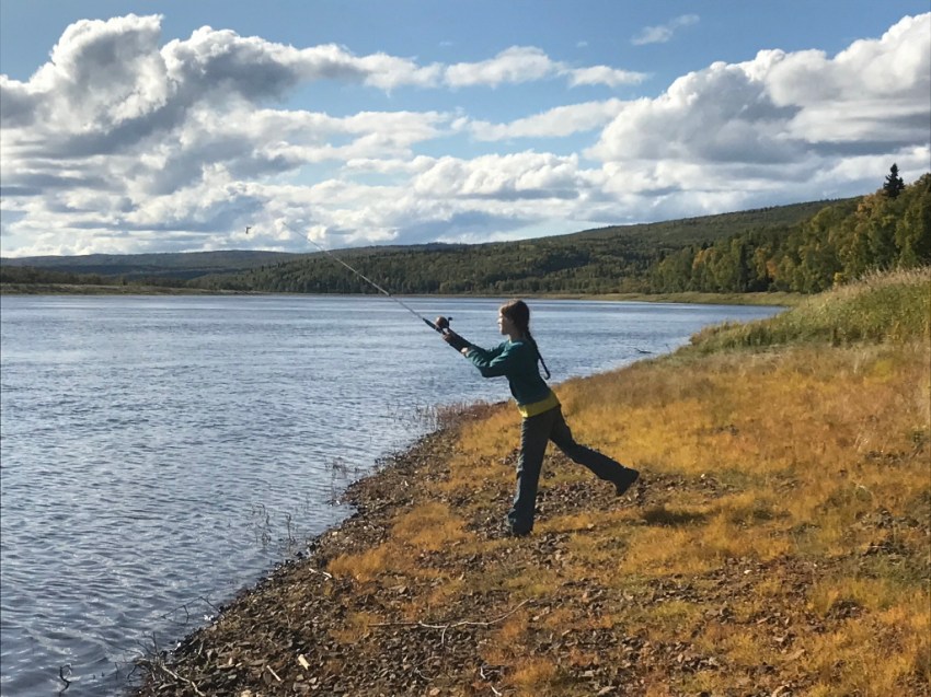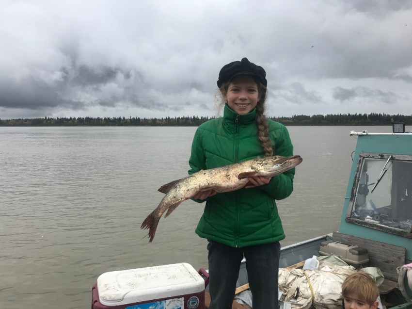 We spent in the night in another cabin, quite cozy from the continuing rain. The next morning, we headed down the Innoko toward its confluence with the Yukon. About 30 miles downriver, we stopped in Shageluk to pick up some fuel, then made a side detour into a lake Marvin had in mind to give Christa opportunity to catch her first fish. It did not disappoint: pike struck, and soon Christa had reeled in a couple. Made for tasty eating that night once we got back to Grayling!