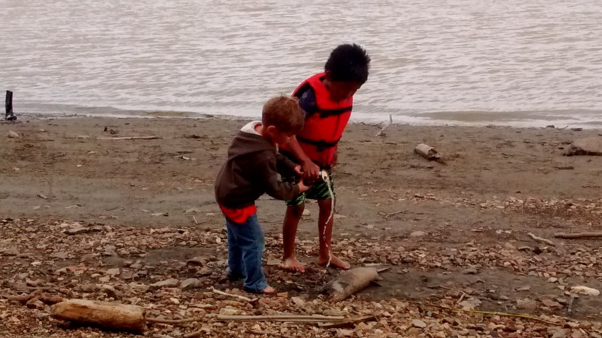 At the bank in Grayling: I wondered what these boys were up to as they walked toward a dead fish on the bank…