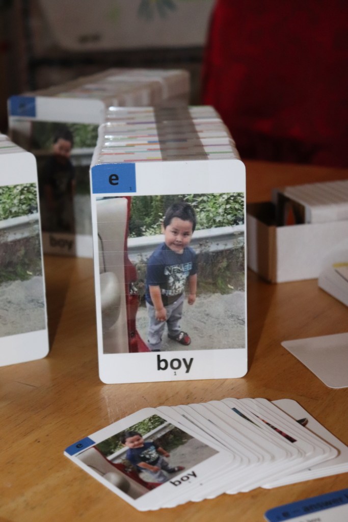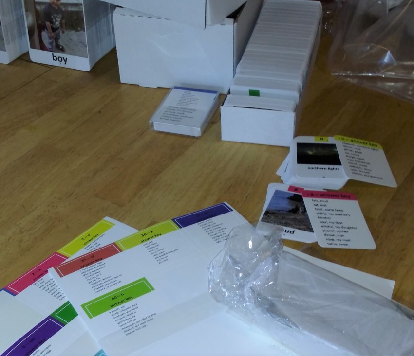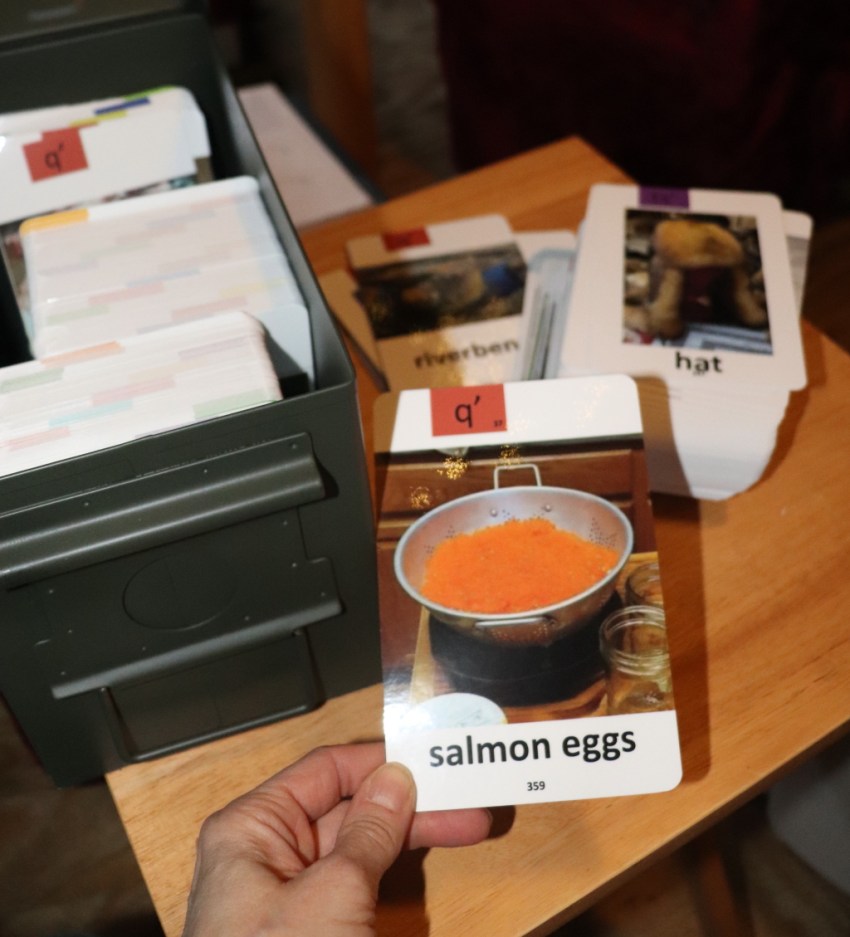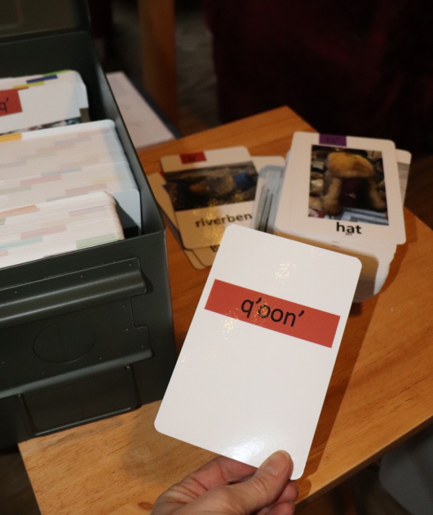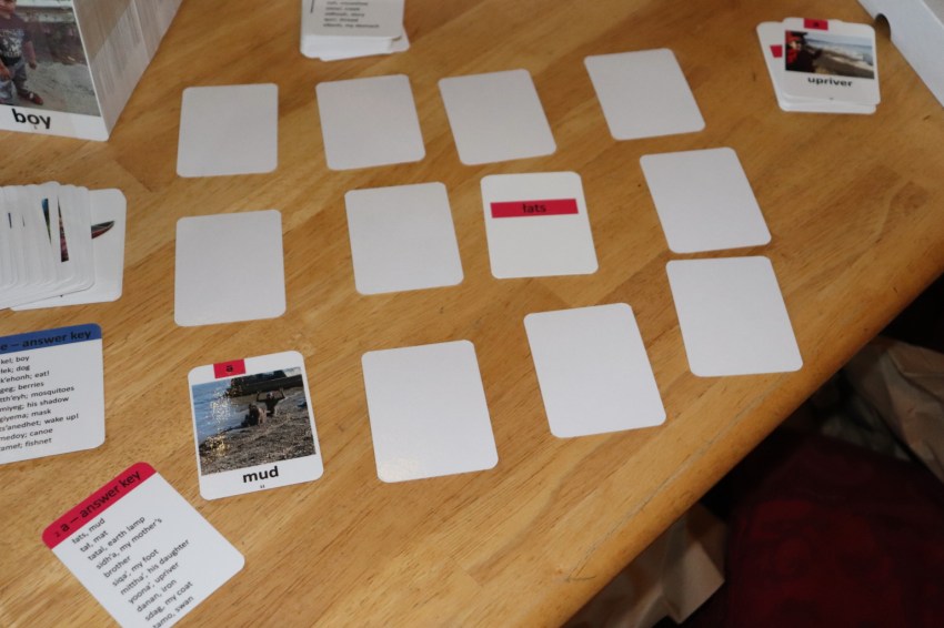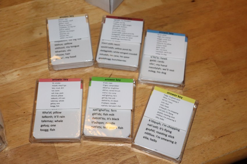 Shannon researched the idea of getting a durable flashcards printed, and after working through the graphic design and packaging elements, we are thankful to have some beautiful, quality sets of 4″x6″ teacher-on-group type cards as well as 2.5″x3.5″ playing card sets for individual student practice. Shannon and kiddos quickly put in a long day of collation and boxing, and a pilot friend was able to drop them off directly at Grayling for us on Monday. That day while on Zoom, we got to watch the class excitedly open the boxes and see bits of their world with their Native language on professional cards! They put them to immediate use, sitting down to practice with the playing cards.