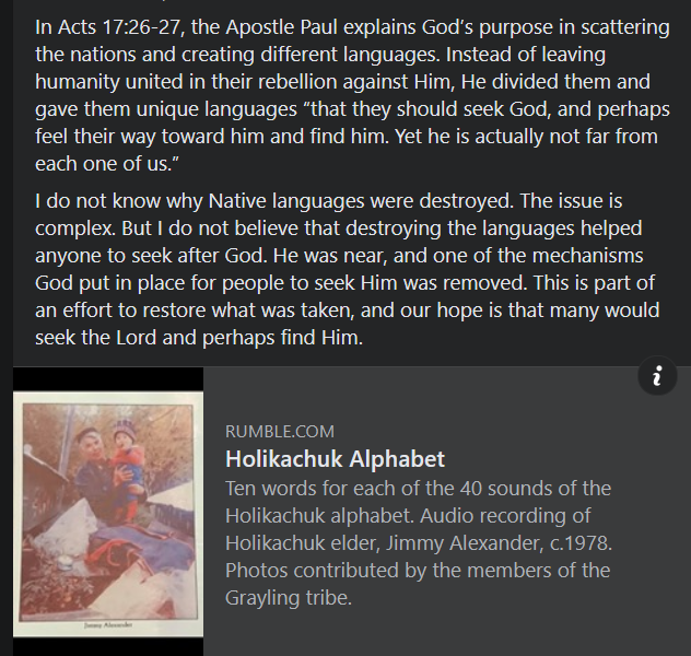 Holikachuk – the original language and name of the village of Grayling – has been lost over the last couple of generations. There is one 81-year old lady in the village who speaks it with a measure of fluency, and it was not her first language. Through the years, there have been several attempts to bring the language back, yet it has not become an identifying mark of life as a Native person in Grayling, including no evidence of any Scripture or hymn/spiritual song having been translated into what remains their heart language.