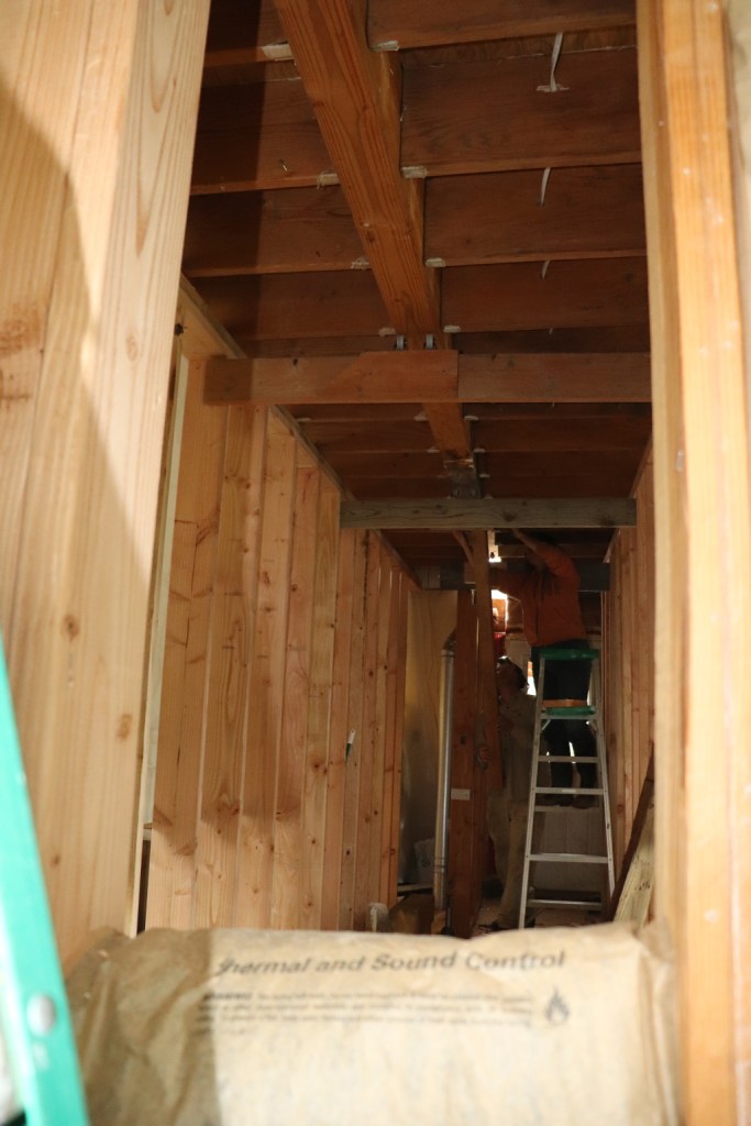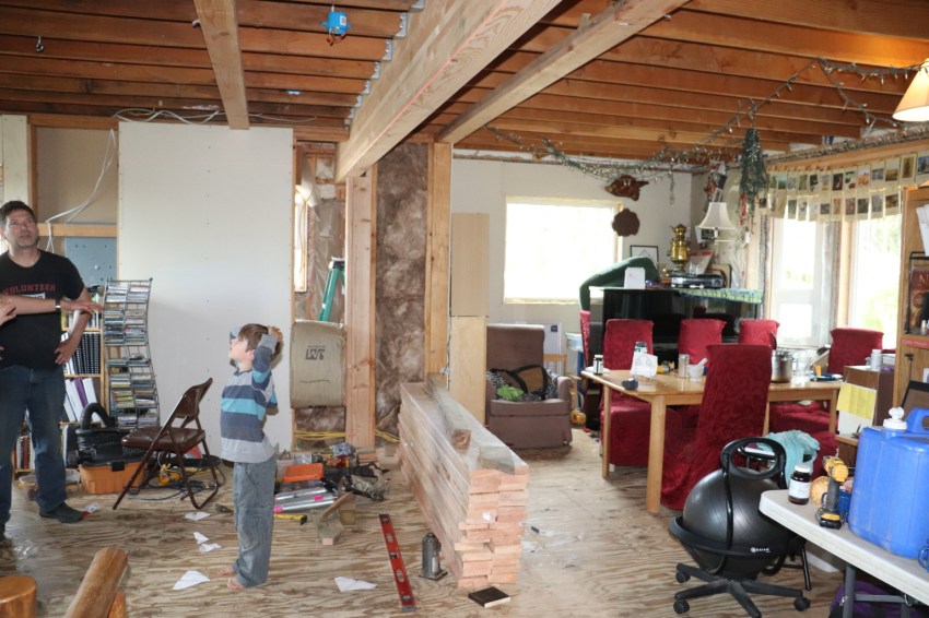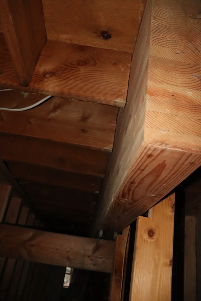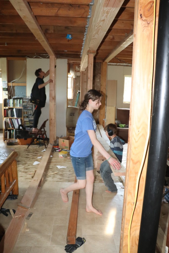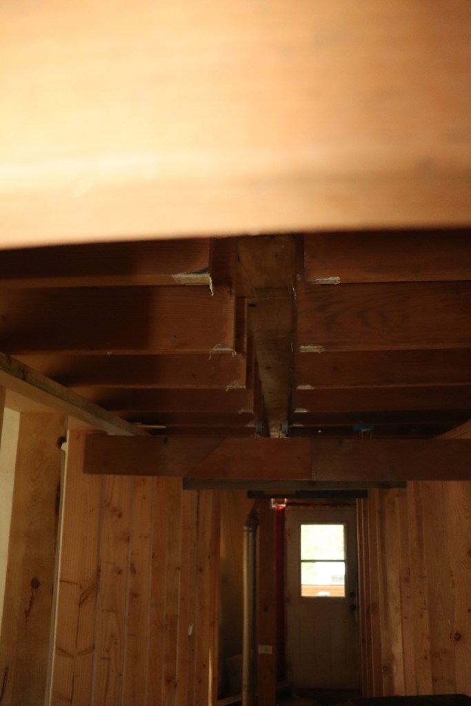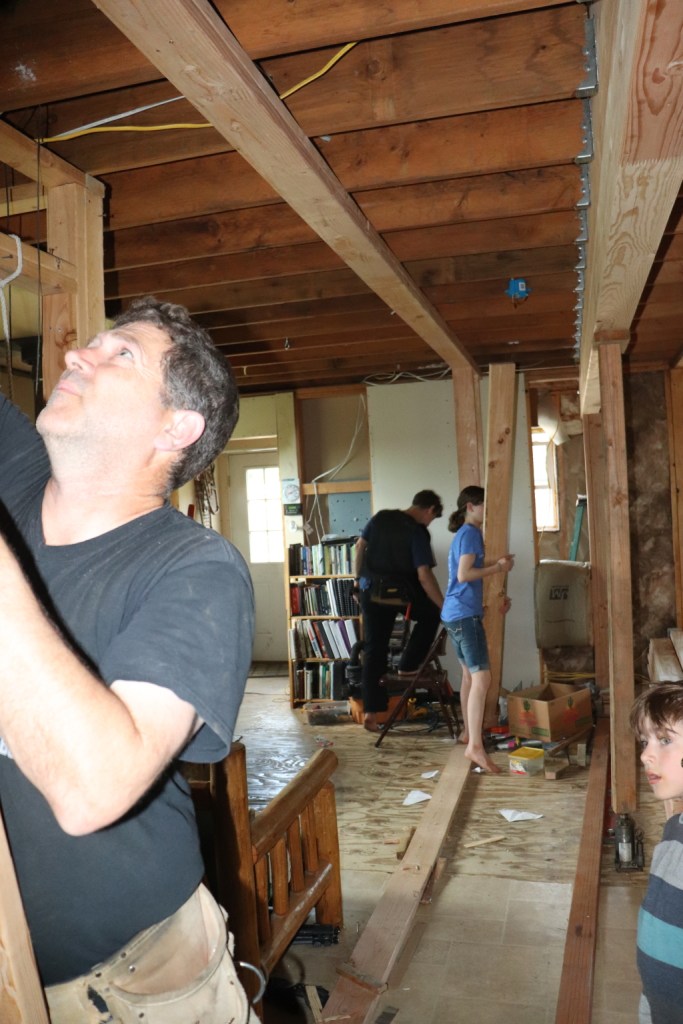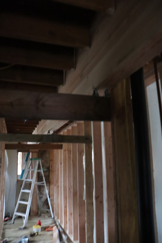 Space and stability! James is pretty pleased to have zero deflection in the beam when the walls were removed, and the joists are visibly straight.