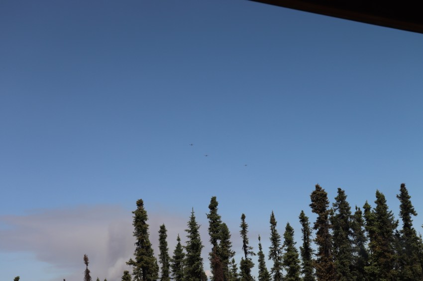 Commercial break: nearby fire to keep an eye on, about 4 miles away. It was hammered hard by water-dropping planes, and we were on the 3-plane formation’s direct flight path night and day. It grew to over 500 acres, and we’re thankful for the tireless crews who kept after it. (2nd pic: the specks in the sky are the planes :))