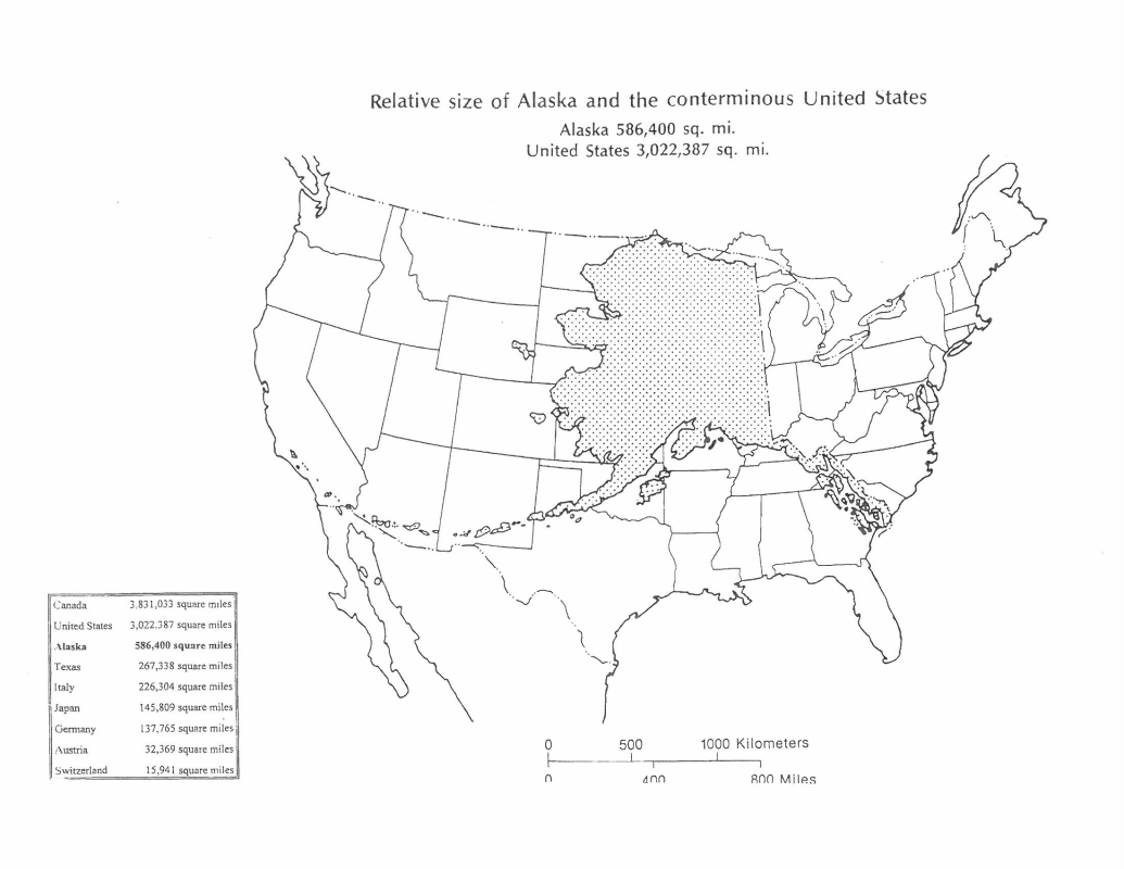 • It has one million acres of land for every day of the year.  It is 2 ½ times larger than Texas.   Its 586,000 square miles would cover 20% of the contiguous United States.